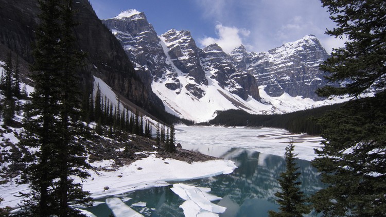 湖面半結冰,湖水碧綠。夢蓮湖曾被加拿大選為加幣二十元的代表圖樣(1969-1979)。