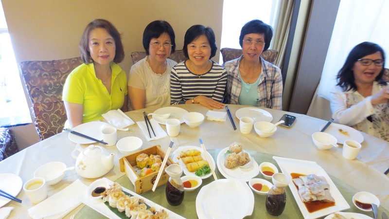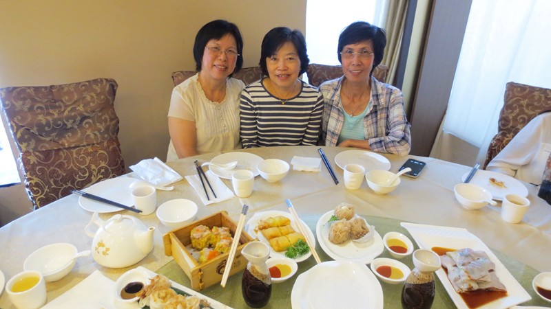 Stella 久居多倫多,因要最少一个半小時的等候,這次是頭一次來,所以也要和何春馨,余小玲(也是洪佳 (69)的好友),劉慧虹拍照留念兼感谢,另外一位忙着拍照的是郭夢雲師母的妺妹郭秀芬,從澳洲悉尼來,好欣赏多市的精美点心。