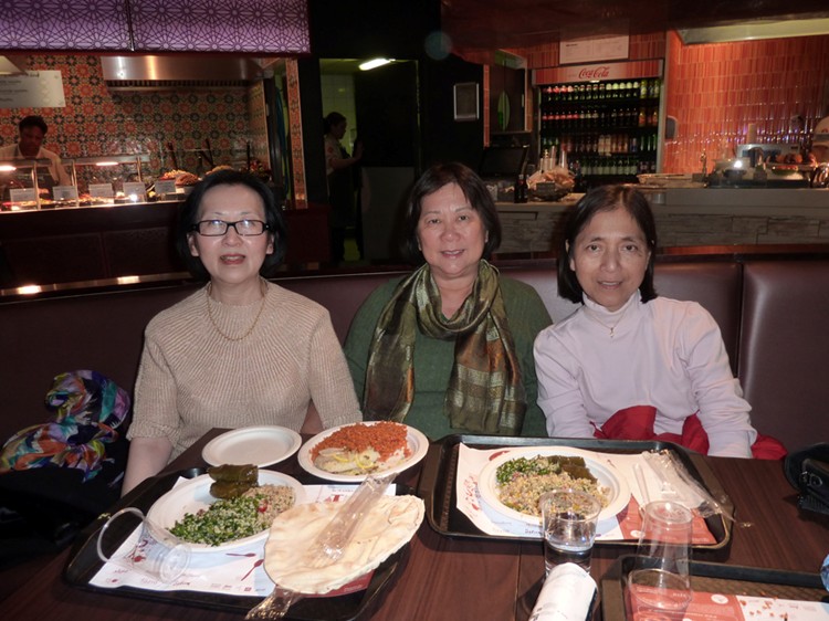 陳淑萍、韓蓮美和莫秀蘭在盧浮宮「世界美食快餐廳」品嚐中東餐。