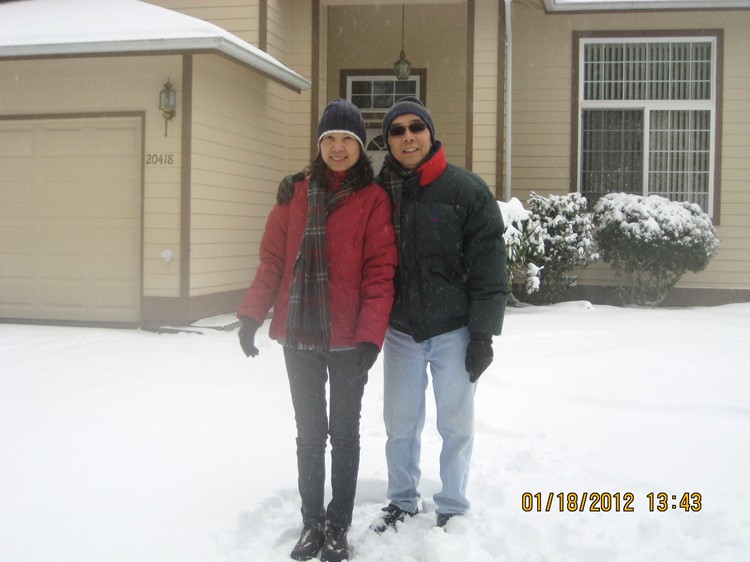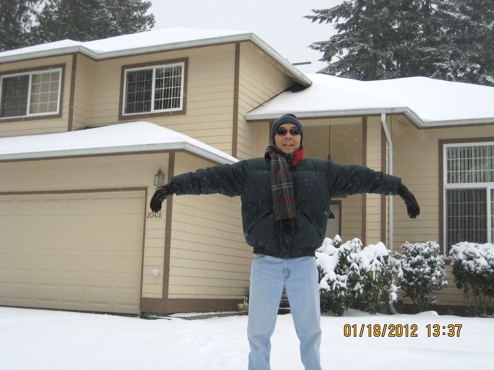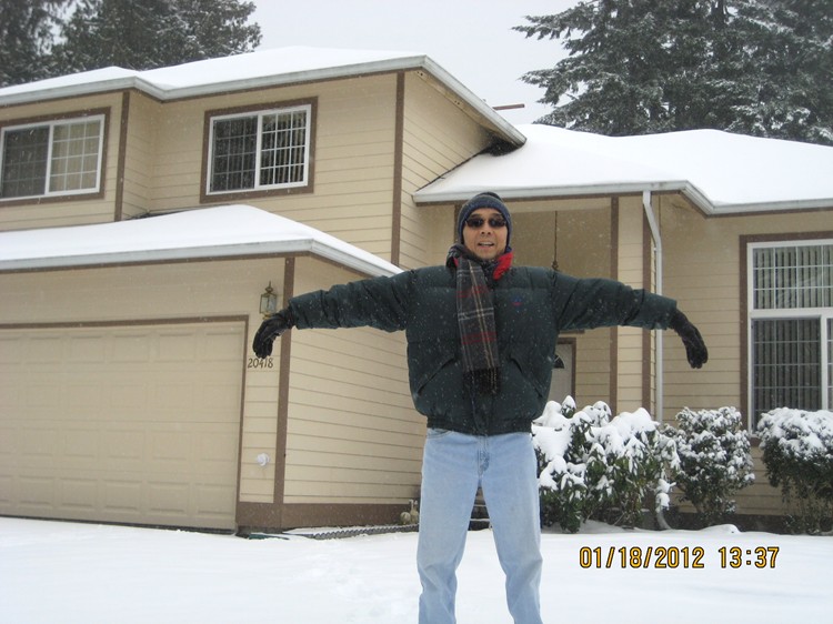 2011年成功接受換腎手術後,家住西雅圖的張偉華,在一場瑞雪下降後感到身心舒暢,在家門外如振翼欲飛的雄鷹。