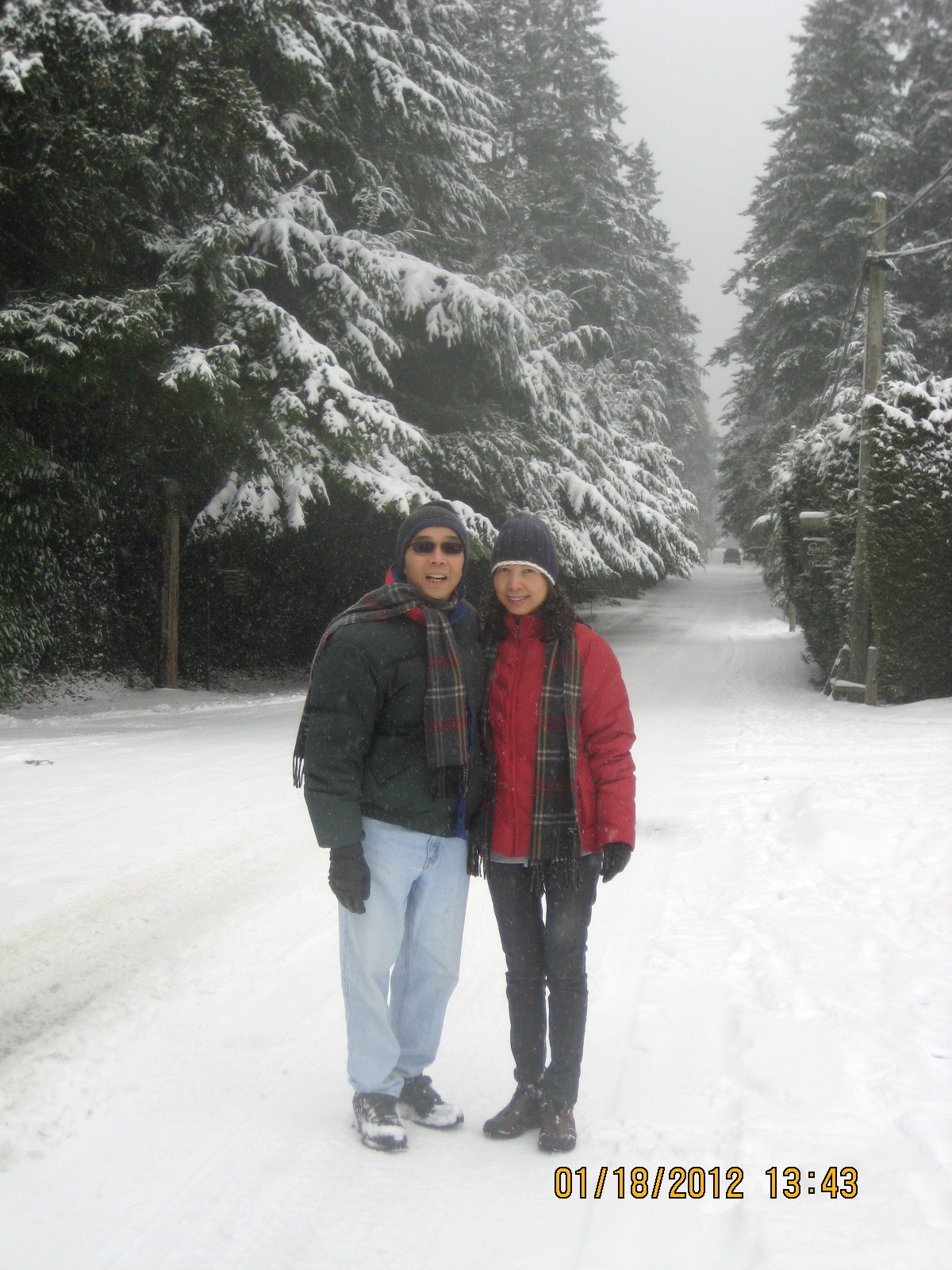 張偉華與愛妻在佈滿皚皚白雪和美麗松樹的小徑前,向同學們傳來康復的喜訊。