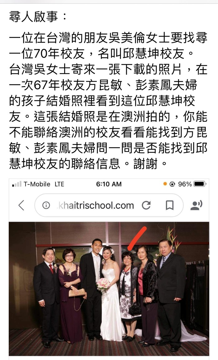 74年班文科畢業生謝秀𡖖正在尋找沈莉萍和戚以雲同學,請與下電郵联絡:christinatruc@ymail.com