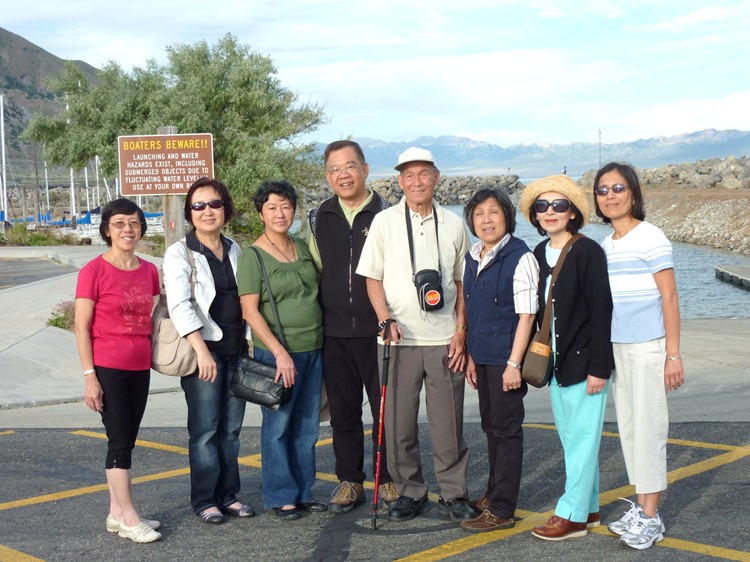 七位69年文科班同學與梁景輝老師,在猶他州鹽湖城的大鹽湖前合照:梁少英、顏秀慧、梁少娟、鄭國基、梁景輝老師、莫秀英、陳淑萍、莫秀蘭。走到微風吹拂著極重鹽味和一望無際的湖畔時,才體會到摩門教先驅,為何將大鹽湖誤會為大海的箇中道理。