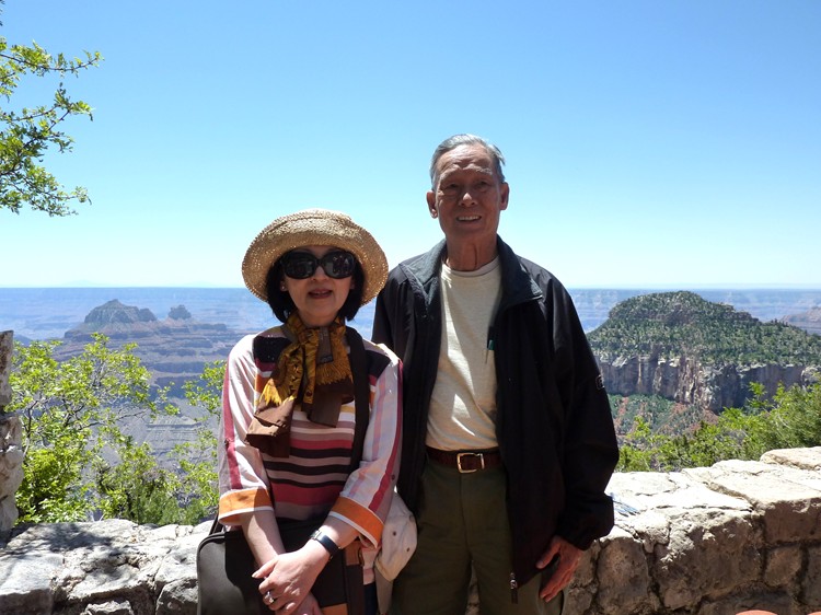 69年文科班陳淑萍與梁景輝老師在景觀最壯麗,在地球上被列為七大奇蹟的北峽谷頂峰,拍下師生難得有機會結伴同遊美國山河的珍貴一刻。